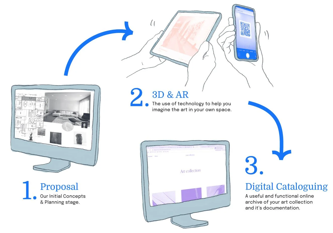 Working in a holistic way, Artful Curation visit you in your home/work via photos, building plans and online calls, as with offshore-based clients. A digital and then VR (Virtual Reality) and AR (Augmented Reality) presentation leads to the next steps before arranging the delivery, curation and installation anywhere in the world.
